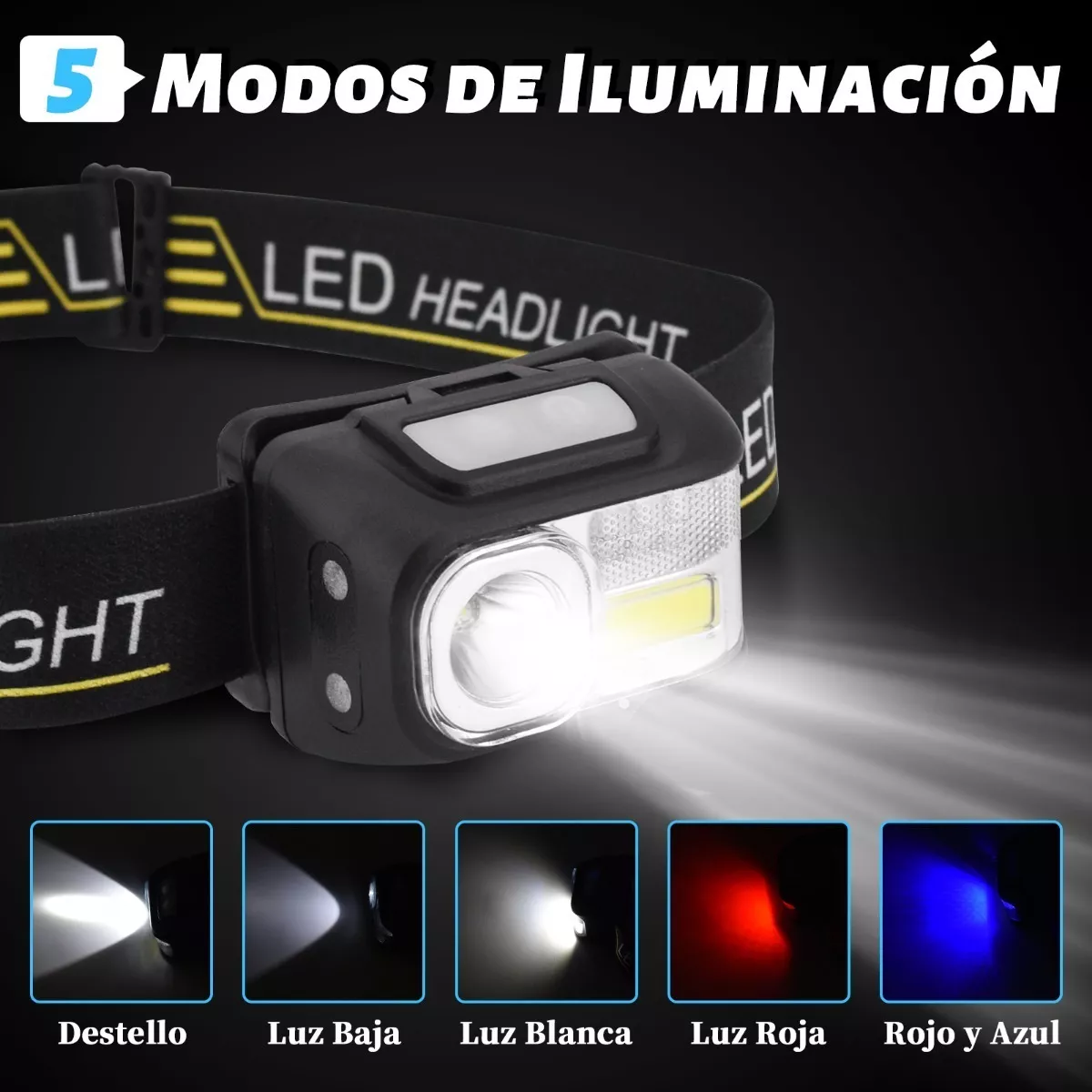 Modos de iluminación: Luz blanca potente (destello), luz blanca baja, luz blanca plano general, luz roja plano general y luz roja y azul plano general.