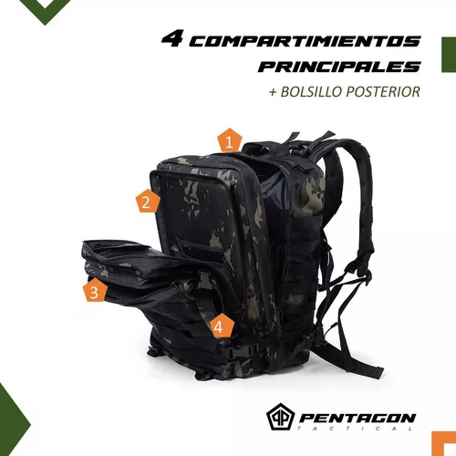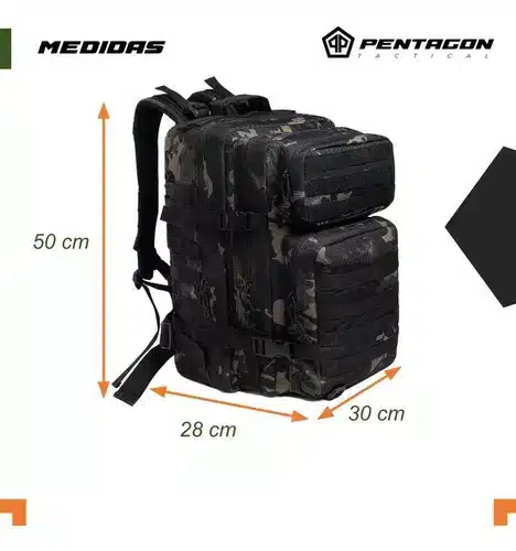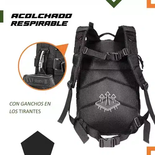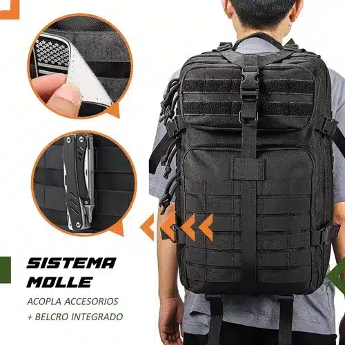 – Capacidad de 45 litros con Sistema Molle en los costados y el frente para adherir accesorios adicionales.
